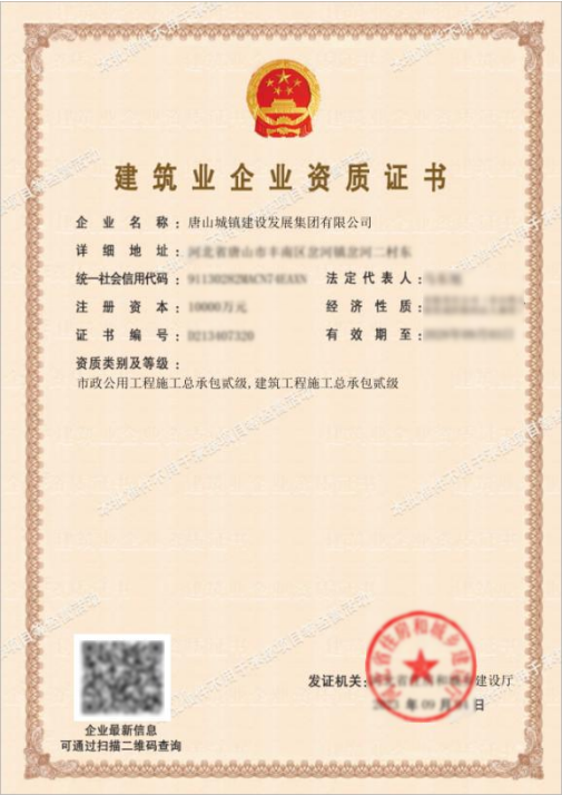 唐山城镇建设发展集团有限公司喜获两项施工总承包二级资质